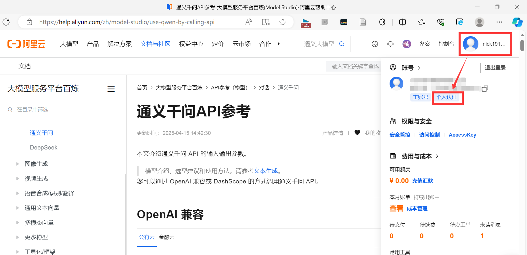 点击开头官方文档链接→右上角头像→去认证(不认证好像无法开通模型)