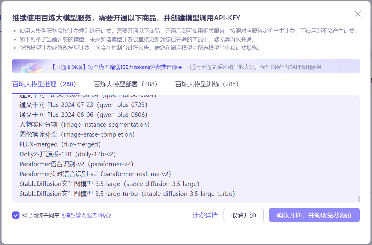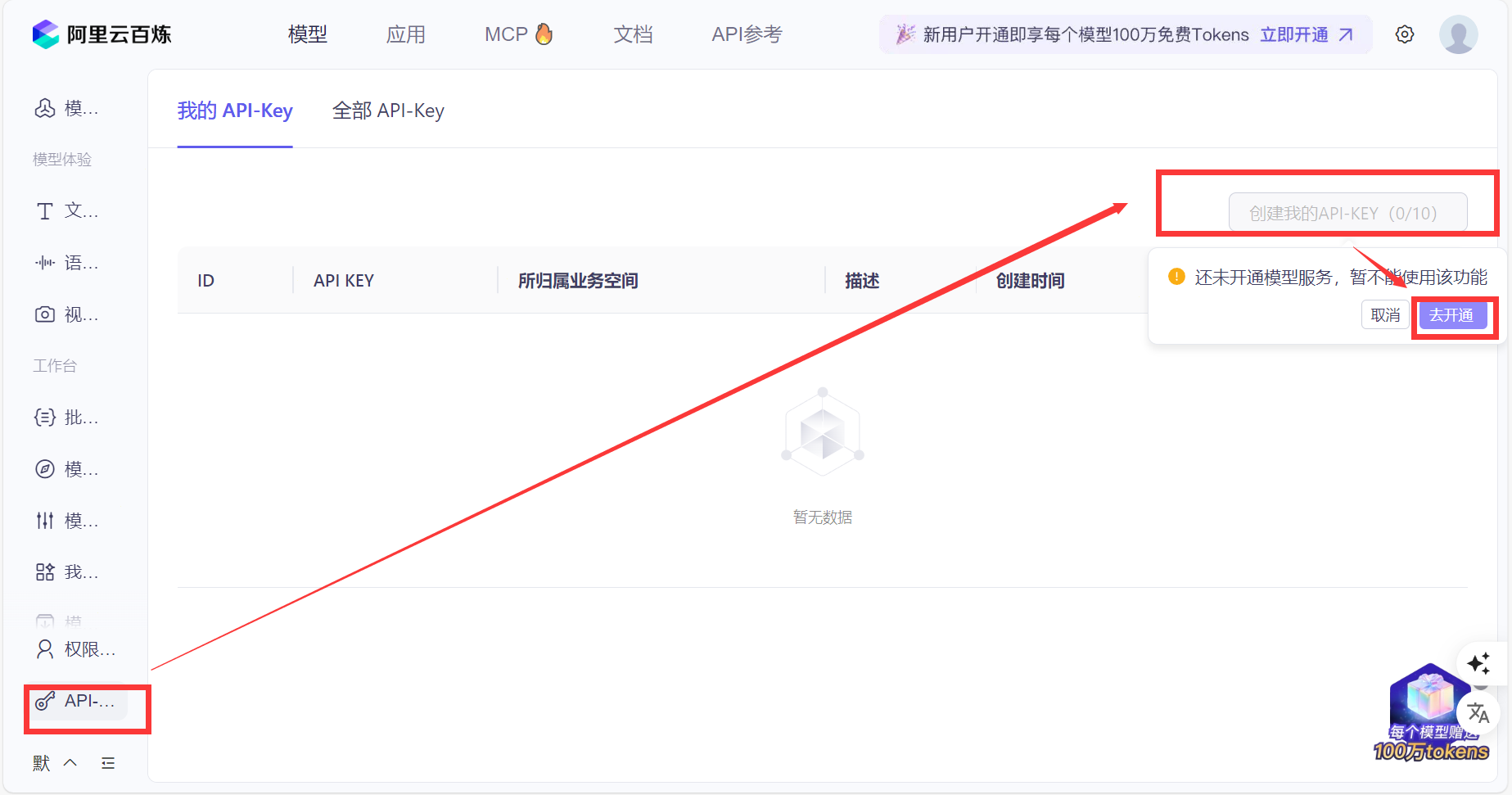 进入阿里云百炼 (aliyun.com)→左侧导航条API-...(这个真的拉不出来,都不知道写的啥)→创建API_Key→开通模型服务