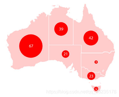 - 气泡地图指定地理区域上方会显示圆形图案,圆形面积与其在数据集中的数值会成正比。