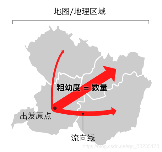 - 流向地图 (Flow Map) 在地图上显示信息或物体从一个位置到另一个位置的移动及其数量,通常用来显示人物、动物和产品的迁移数据。