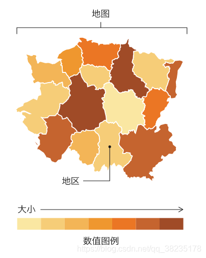 - 地区分布图通常用来显示不同地理分区或区域(不同颜色或图案)与数据变量之间的关系,并把所显示位置的数值变化或模式进行可视化处理。