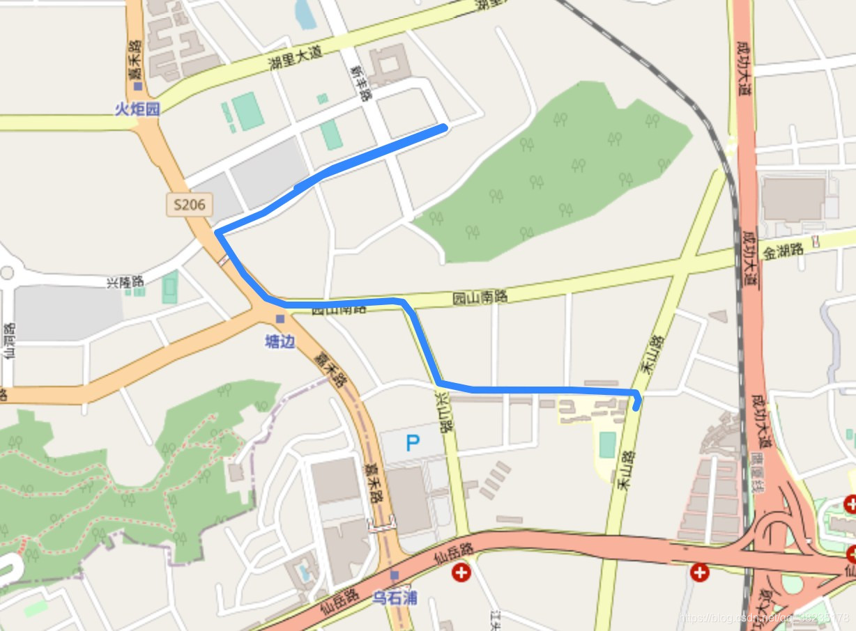 my_PolyLine=folium.PolyLine(locations=taxigps2019[taxigps2019['CARNO'] == '0006d282be70d06881a7513b69fcaa60'][['LATITUDE', 'LONGITUDE']].iloc[:50].values,weight=5)