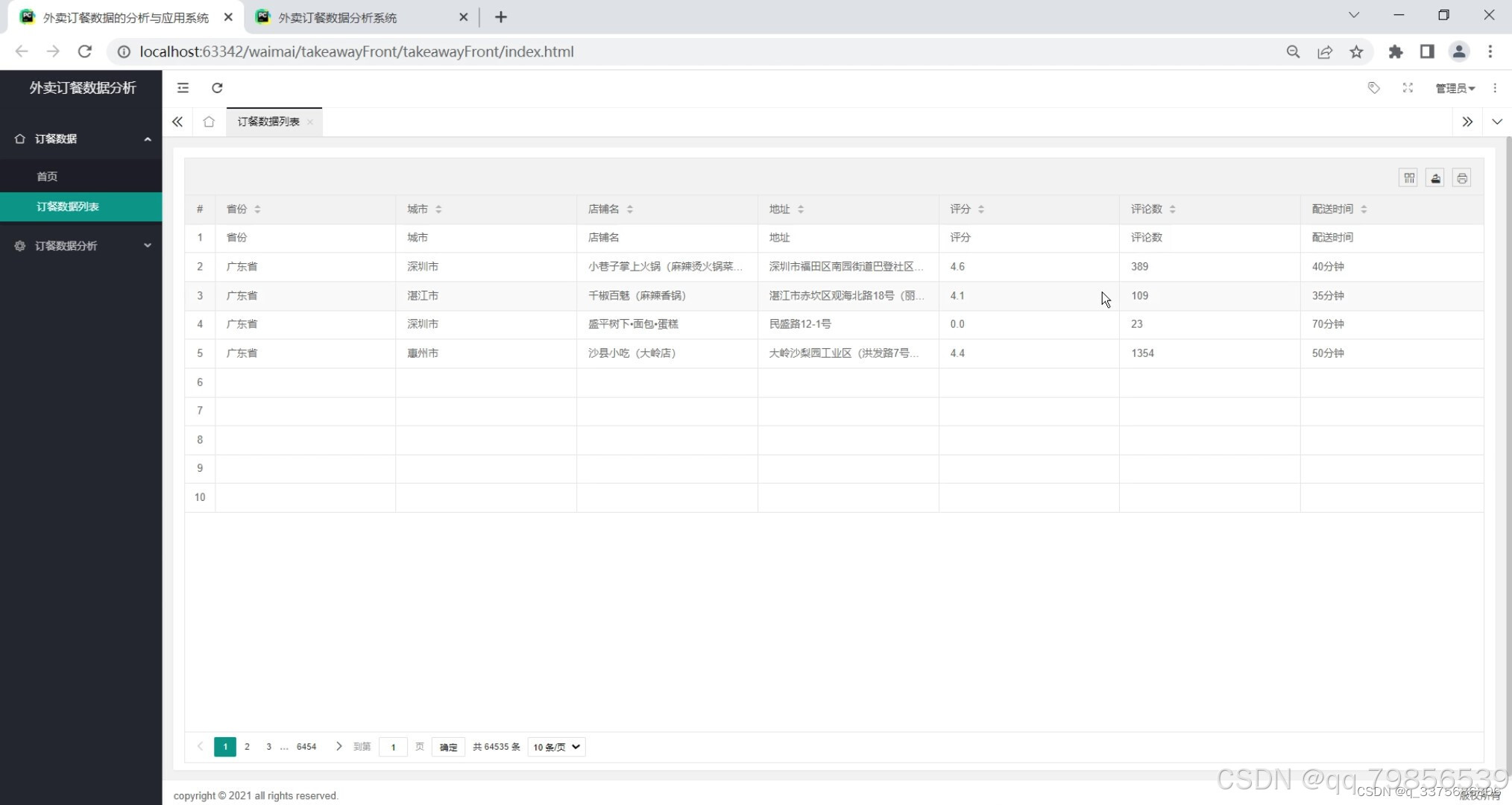 外卖订餐数据列表:该模块以列表形式展示详细的订餐数据,包括订单号、商家名称、订餐时间、订餐金额等关键信息,方便用户查询和导出数据。