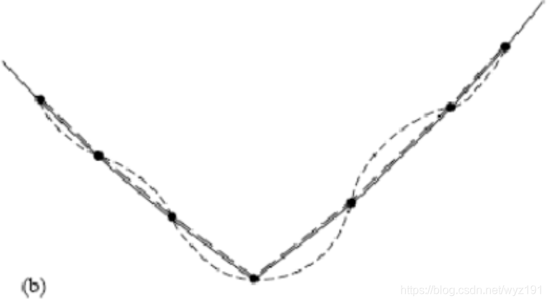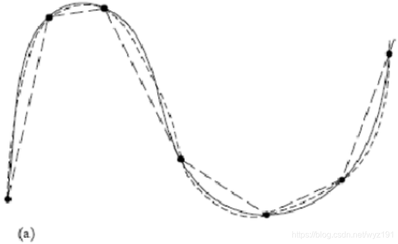 3.多项式逼近:为复杂函数寻找近似替代多项式函数,其误差在某种度量意义下最小。(逼近只要求曲线接近型值点,符合型值点趋势。)