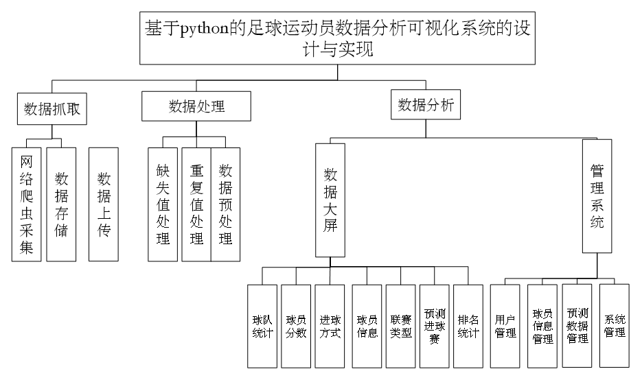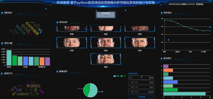 数据可视化模块的实现依赖于多种技术的协同工作,使用Python编写的爬虫程序负责从网站上抓取海量数据,将这些非结构化数据导入到Hadoop分布式文件系统中进行存储和管理,利用Spark框架对这些大规模数据进行快速的计算和分析,将处理后的结果存入Hive数据库中以方便后续查询和检索,后端采用Django框架搭建Web应用服务器,前端则使用Vue.js库来创建交互式界面,并通过Echarts图表库绘制各种可视化图形。数据大屏主要包含球队统计,球员分数,进球方式,球员信息,联赛类型,预测进球数,球员场次,排名统计等信息模块。