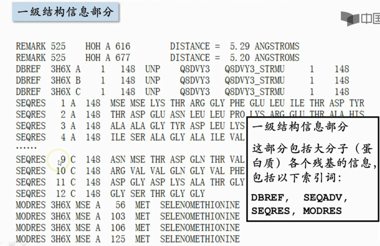- DBREF:一级结构信息:该蛋白质在蛋白质序列数据库UniProt中的检索号等信息