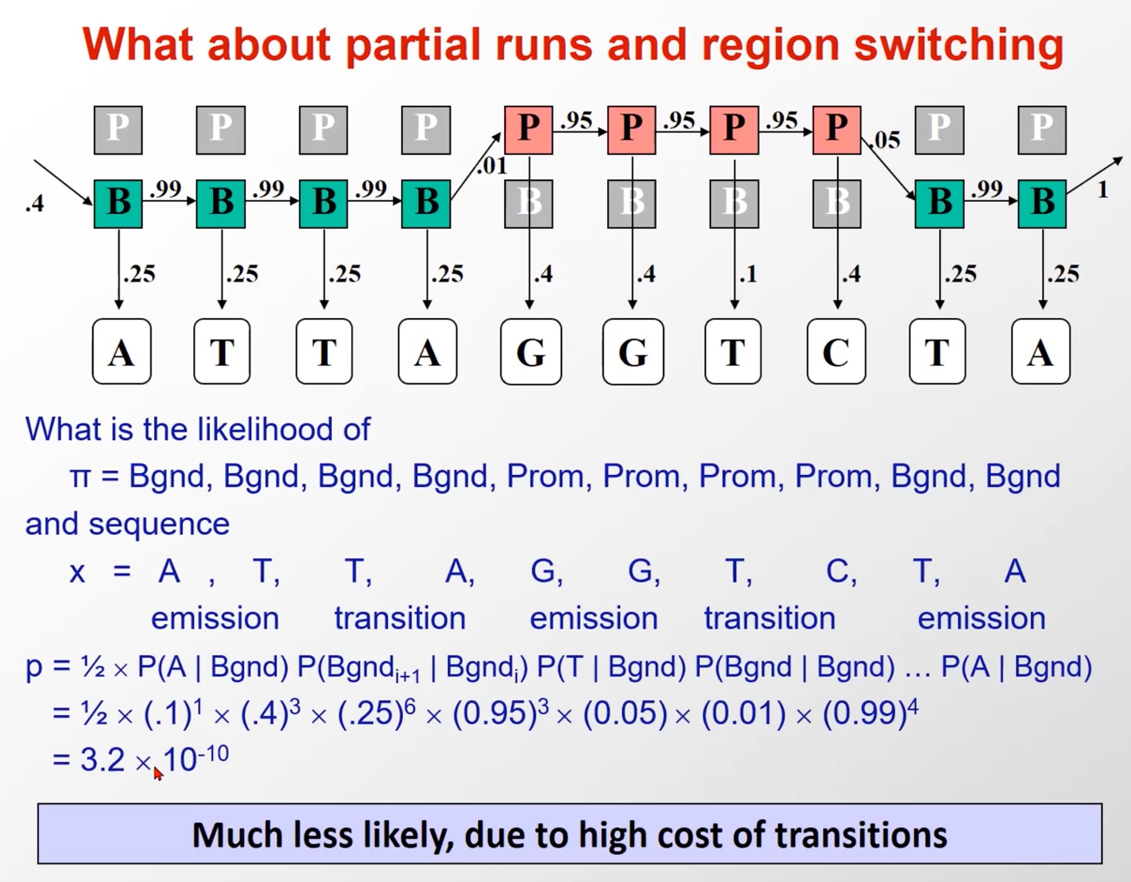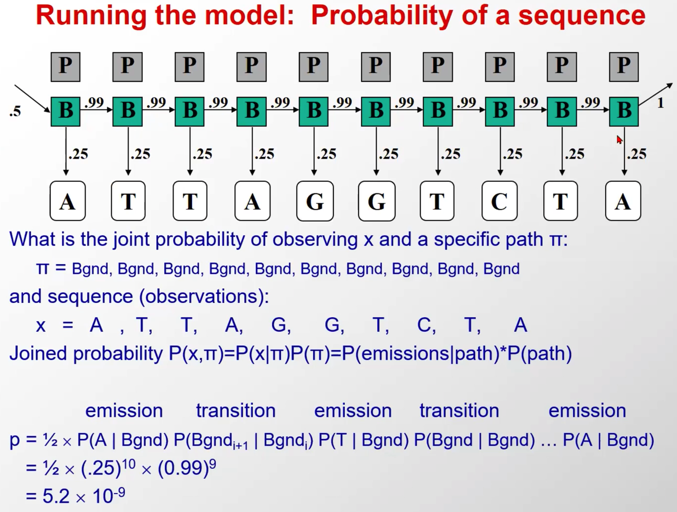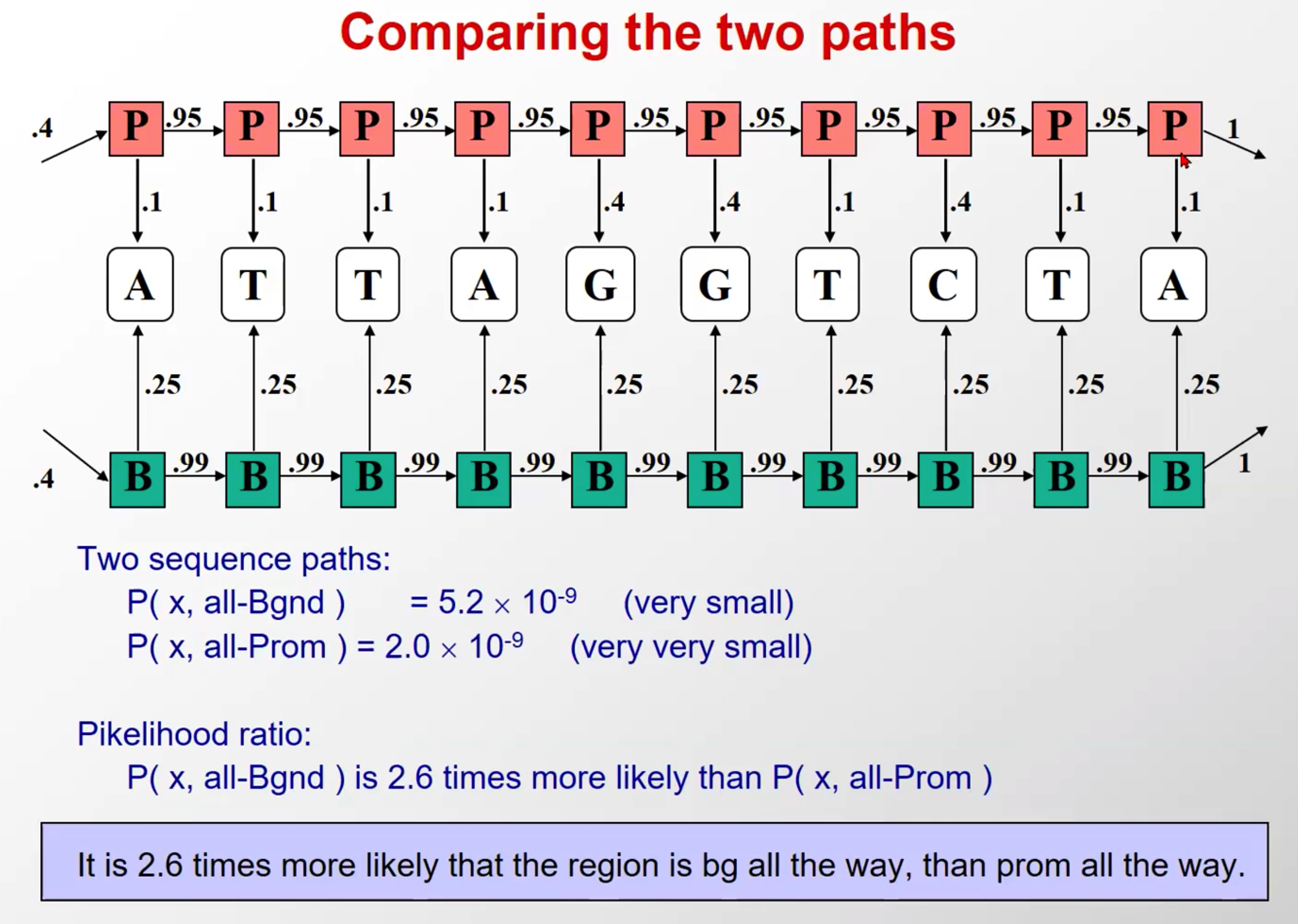 - 首先给定该观察序列,然后比较隐含层序列全是background(一种假设)和隐含层序列全是启动子(另一种假设),该观察序列出现的概率前一个是比后一个高的