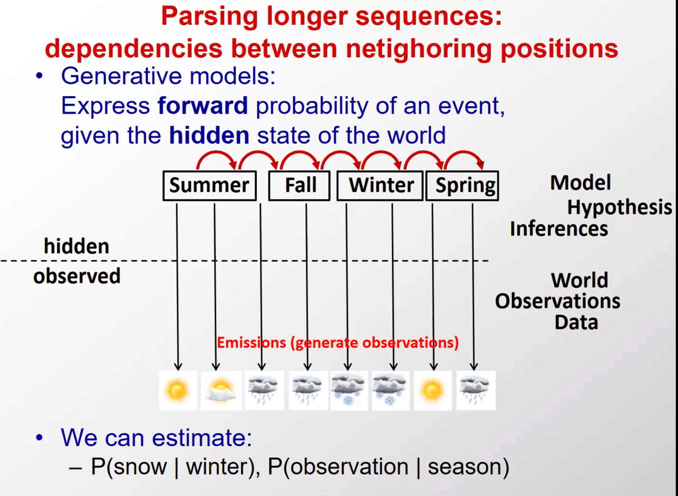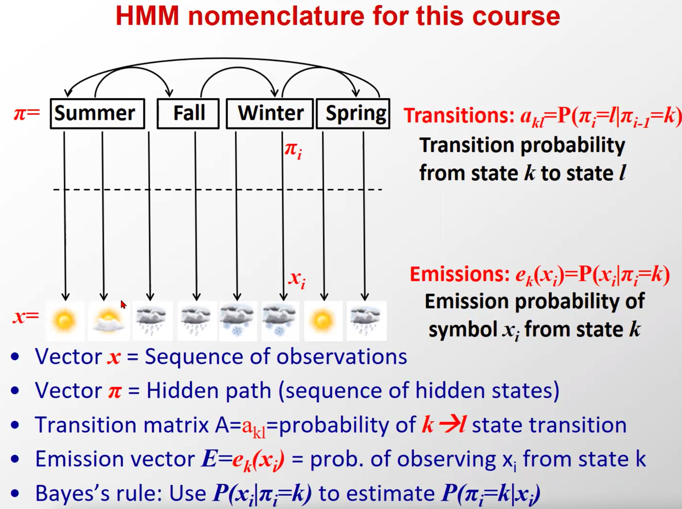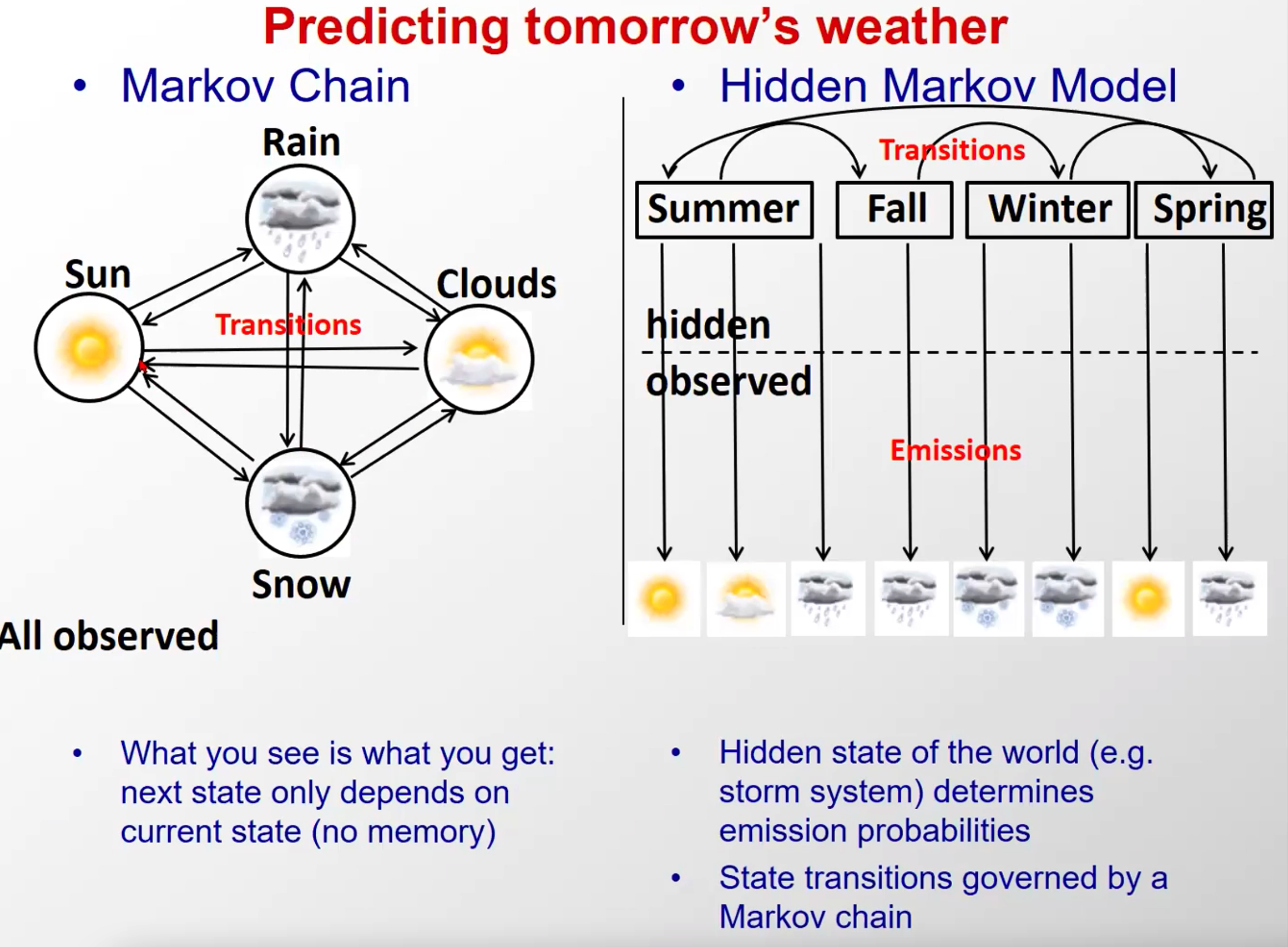 这个图里,马尔科夫链的隐含态是天气,在隐马尔科夫中天气是观察态,季节是隐含态,注意区分