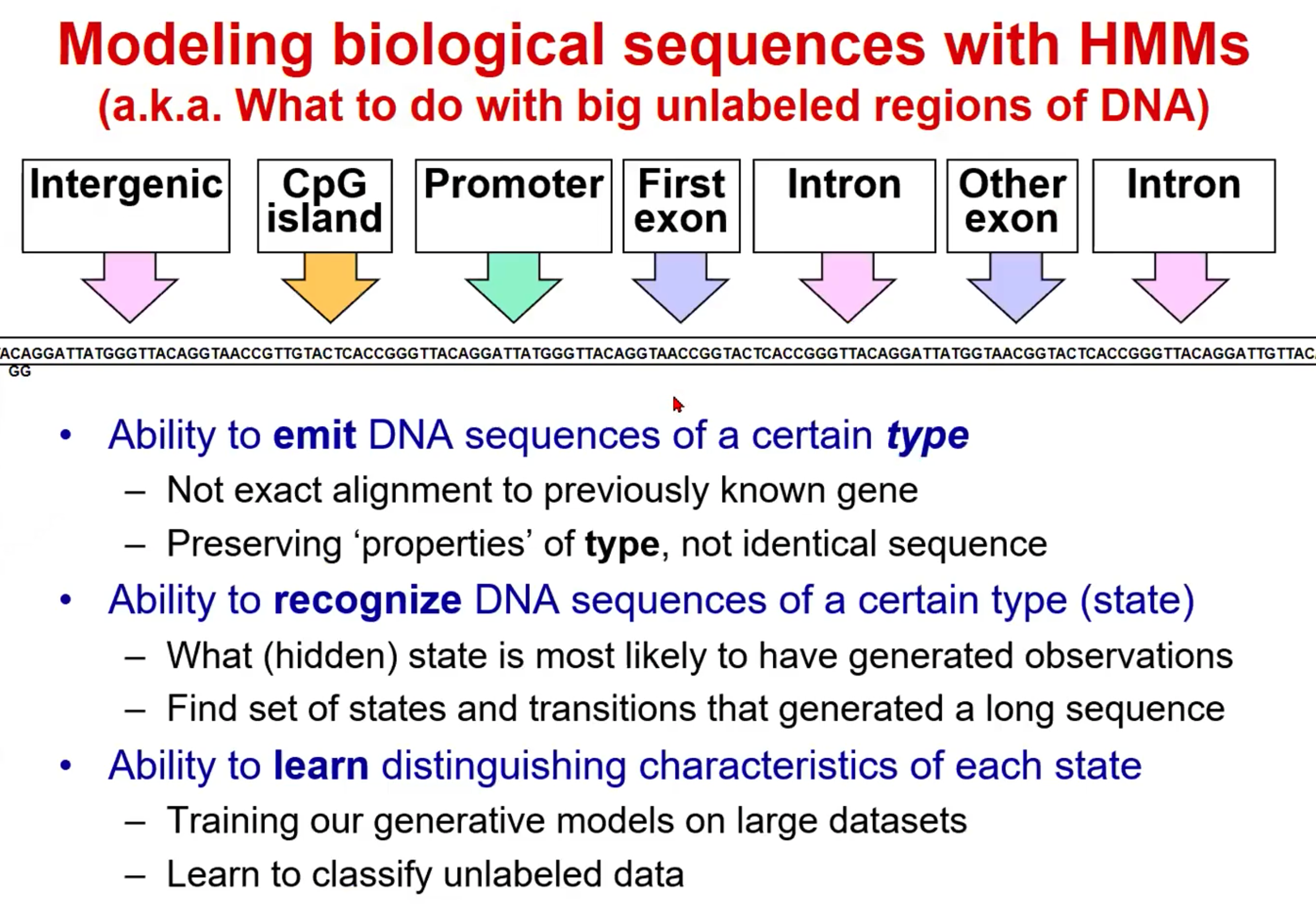 - 能够识别特定类型的DNA序列状态: 指在DNA序列中能够识别某种特定的状态,如一段序列是起始子、外显子、内含子等。通过机器学习算法,可以确定哪个隐藏的状态最有可能产生观察到的结果,并找到一组状态和转移关系,以生成较长的DNA序列。