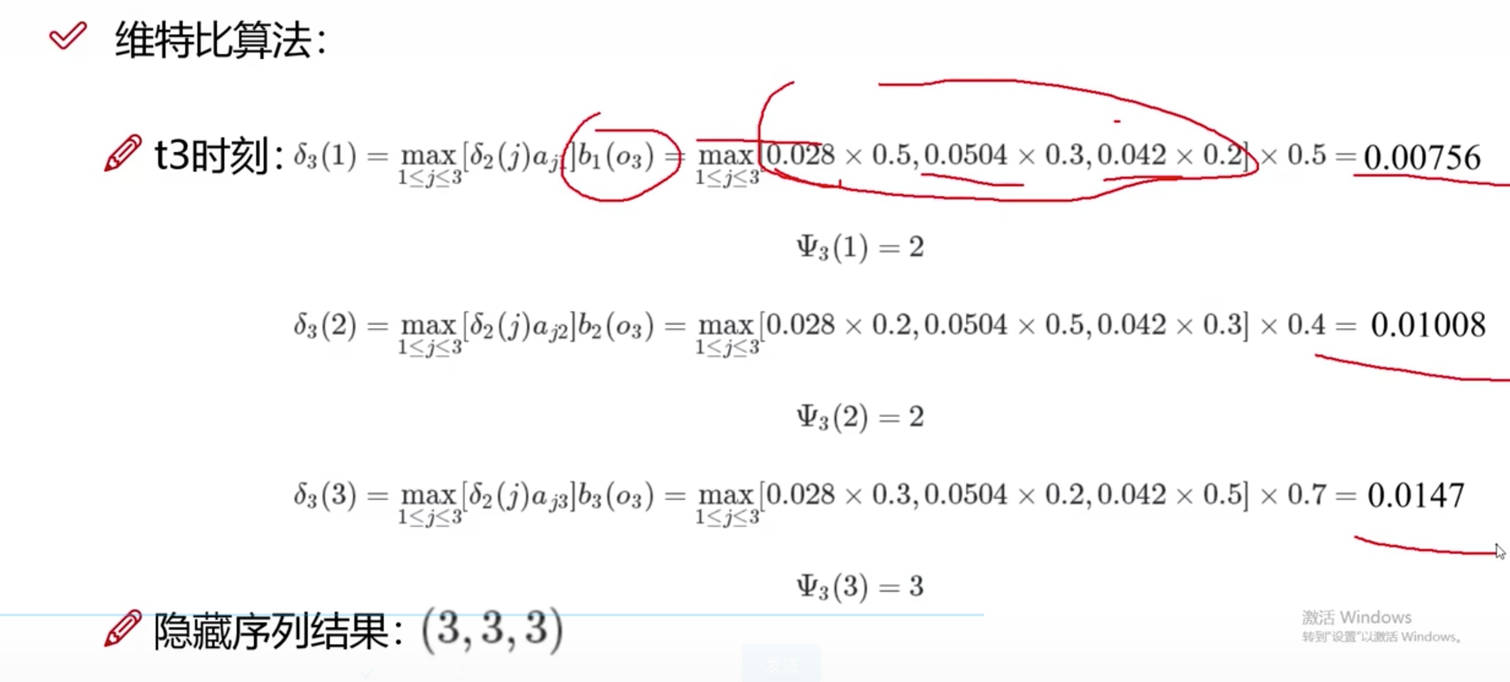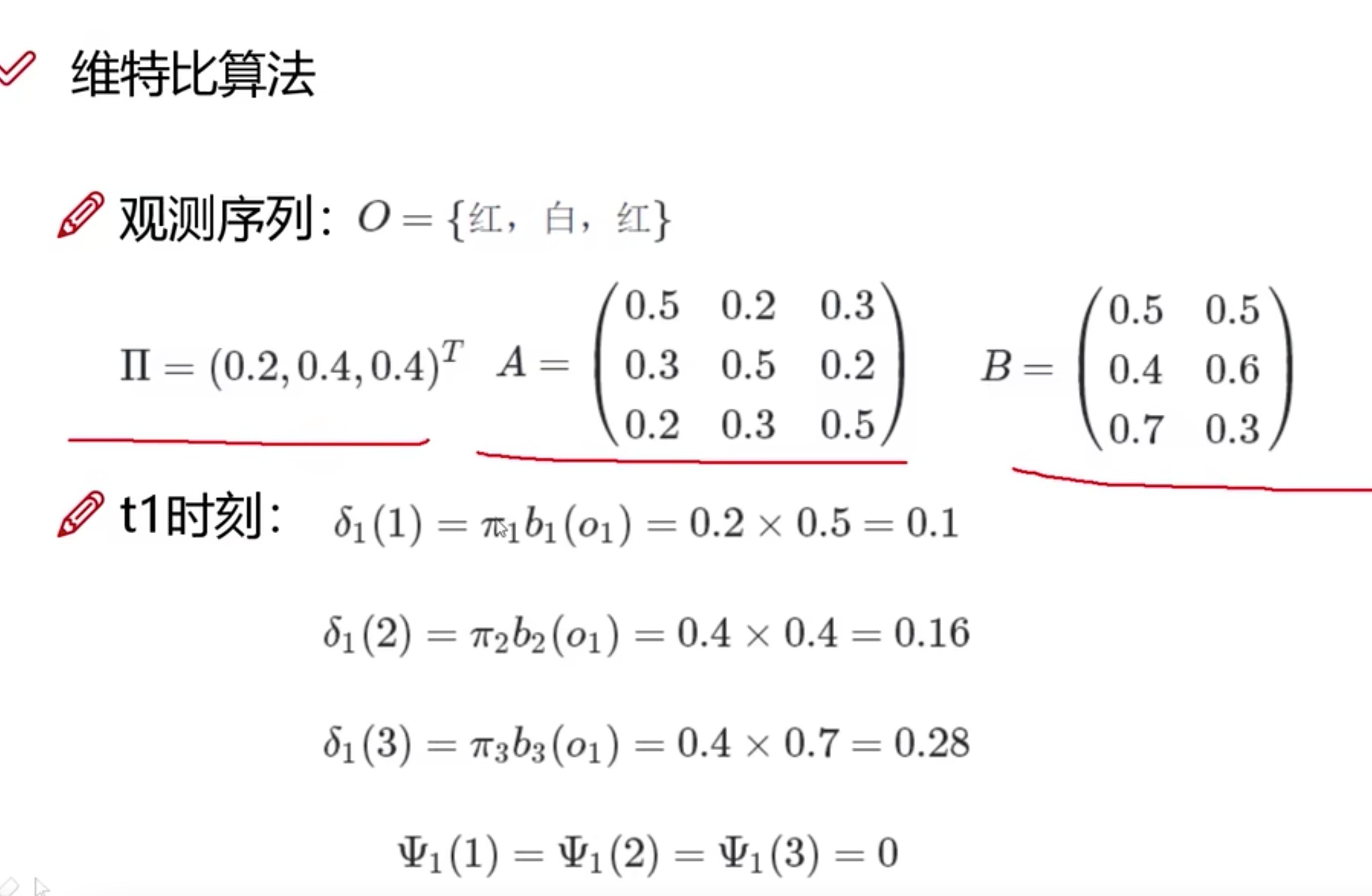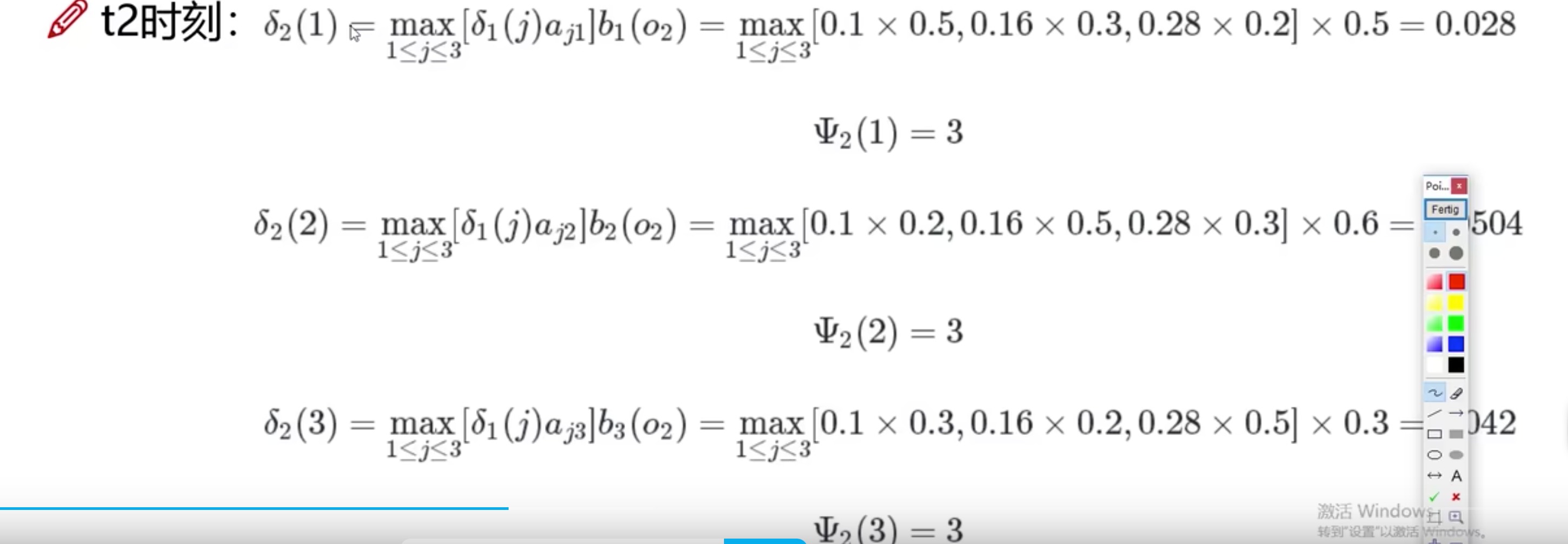 - 以t2时刻1号盒子为例子,就是t1时刻的概率(三个盒子)分别乘上对应转移到1号盒子的概率,其中取最大值,然后再乘上1号盒子中抽到白球的概率(发射概率)