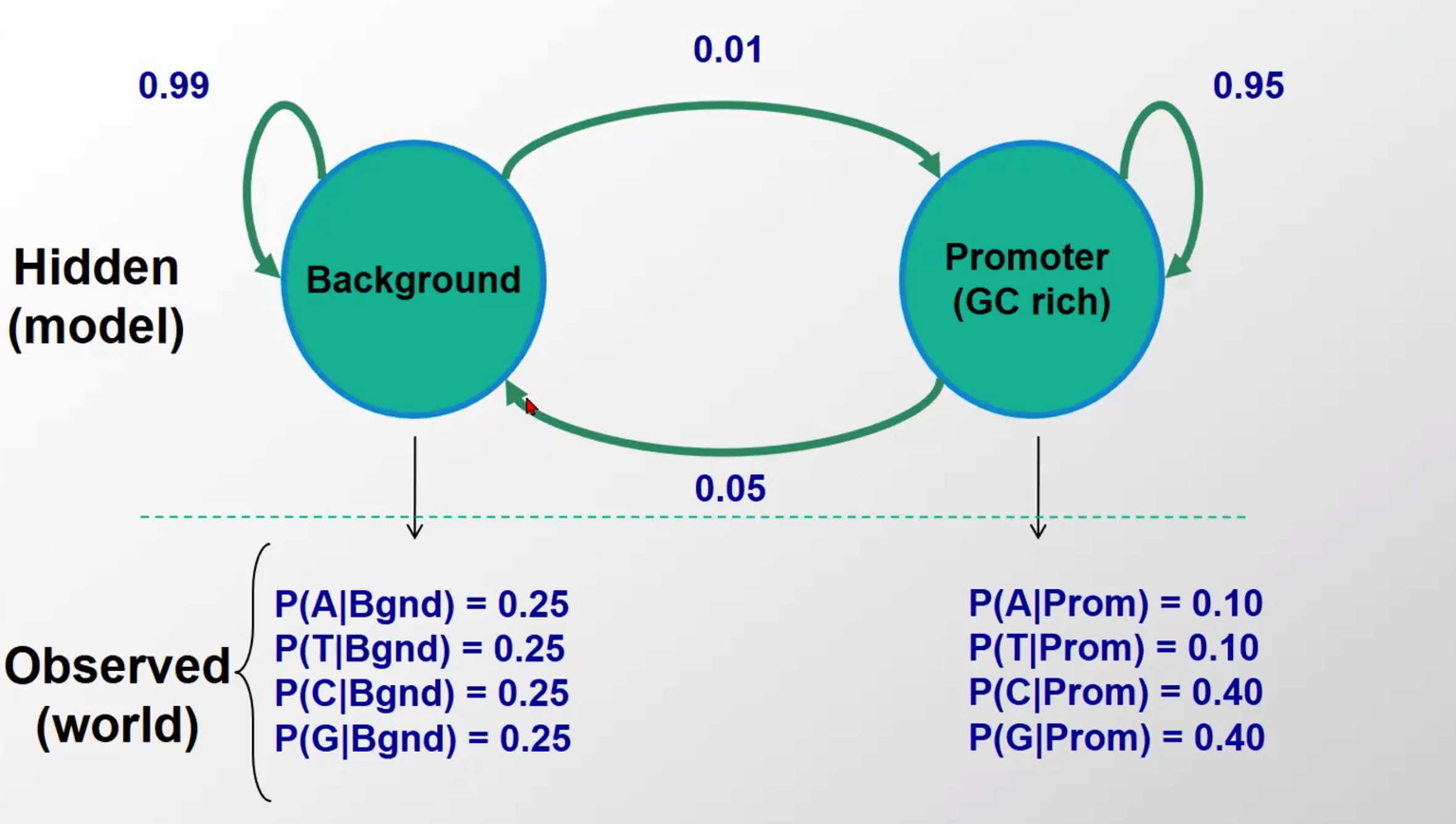 隐含态:前一个碱基是属于background的情况下,下一个碱基99%还是background,1%是启动子。而前一个碱基是属于启动子的情况下,其下一个碱基有95%是启动子,5%是background