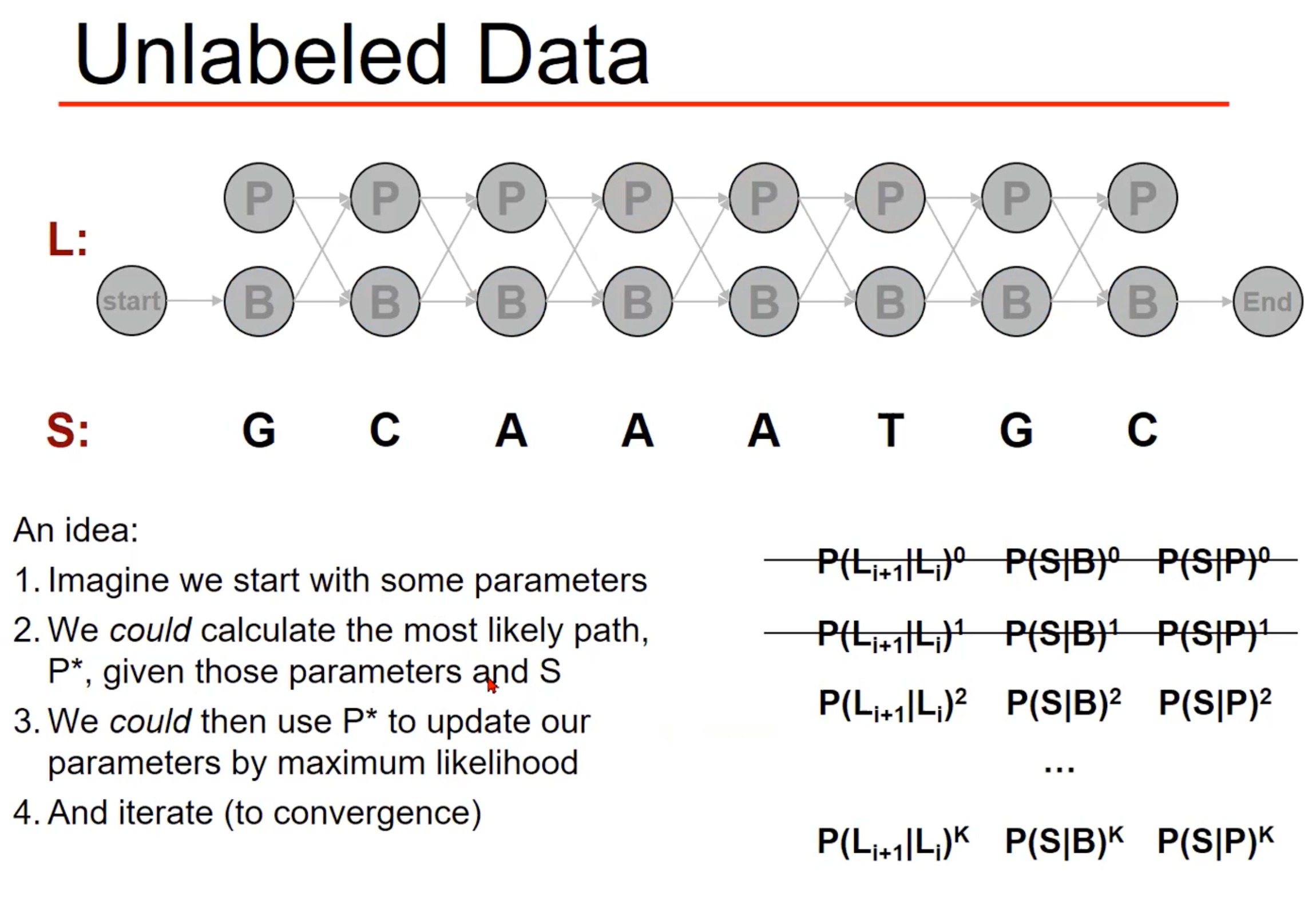 - 其实这是HMM的第三个研究内容,就是求解参数。数学推导比较复杂,其实是采用了EM算法(过程类似于Kmeans),就是不停的迭代,通过极大似然估计找到最佳