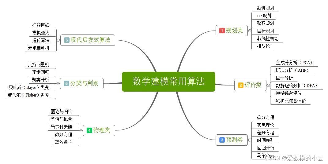 我将数学建模中常用的算法分了六大类:规划类、评价类、预测类、物理类、分类与判别、现代启发式算法。