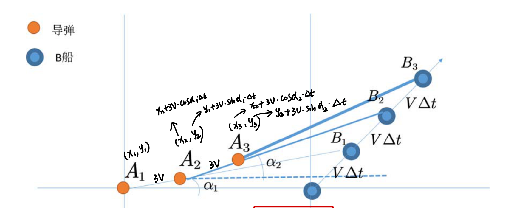 x(1)=x(1)+3*v*dt*cos_alpha; y(1)=y(1)+3*v*dt*sin_alpha; % 计算新的导弹的位置
