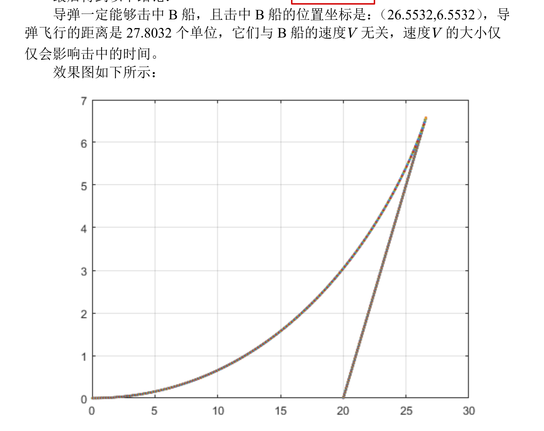 disp(['导弹飞行',num2str(d),'单位后击中B船'])