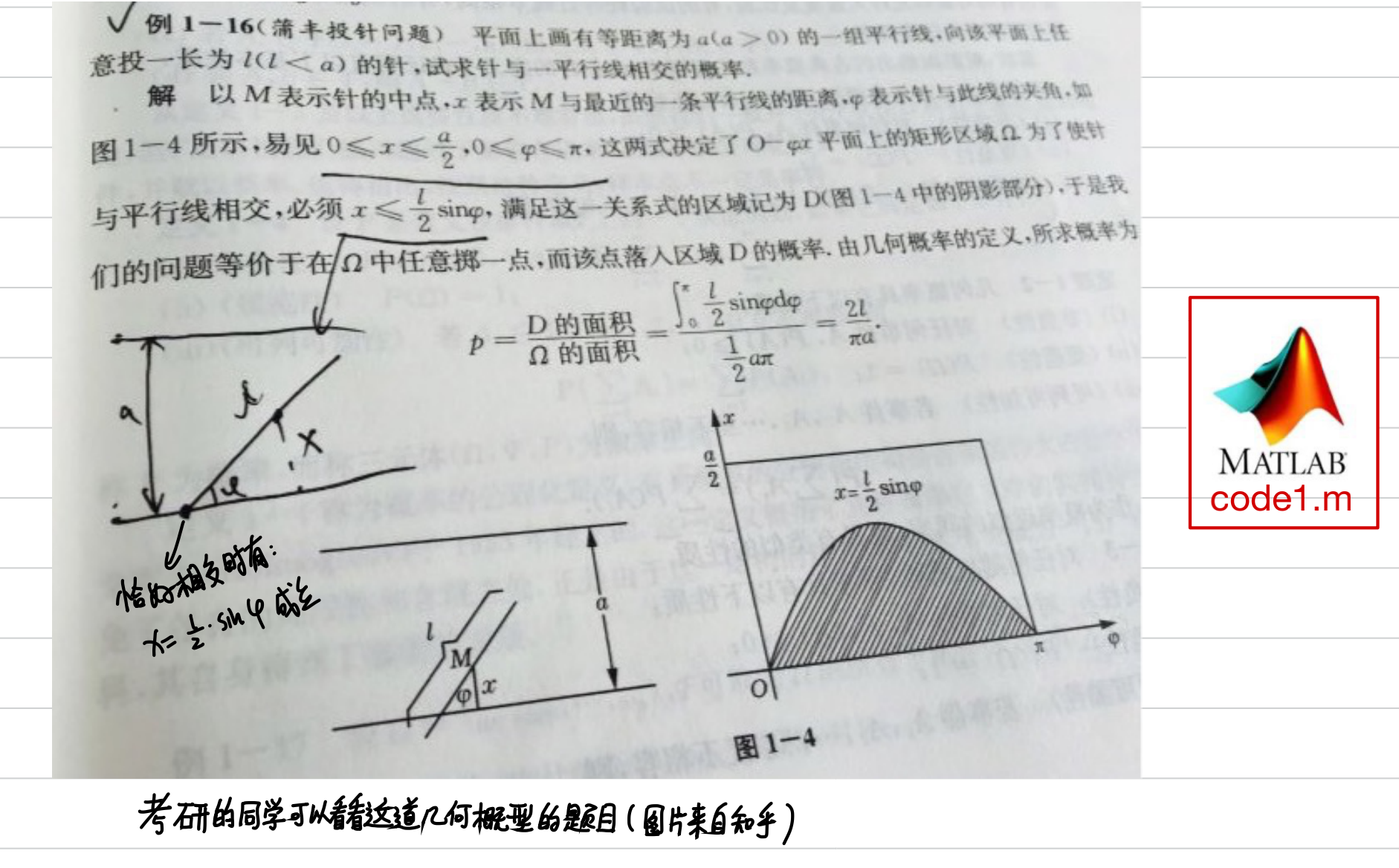 phi = rand(1, n) * pi; % 在[0, pi]内服从均匀分布随机产生n个数,phi中的每一个元素表示针和最近的一条平行线的夹角