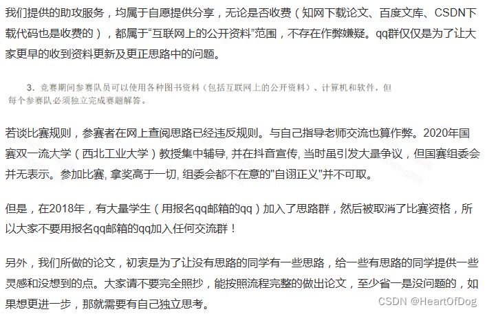另外,比赛的过程中十分枯燥,并且会遇到很多难题,但请一定务必坚持下去(毕竟报名费也够吃一顿的火锅了),可以买一些思路分享,毕竟拿到奖后还能用来评奖学金。但对参考资料的可信度要有自己的判断,形成完整的论文并提交就有很大概率可以拿到奖了。以上是我个人的一些经验和建议,希望可以帮助到同学们。