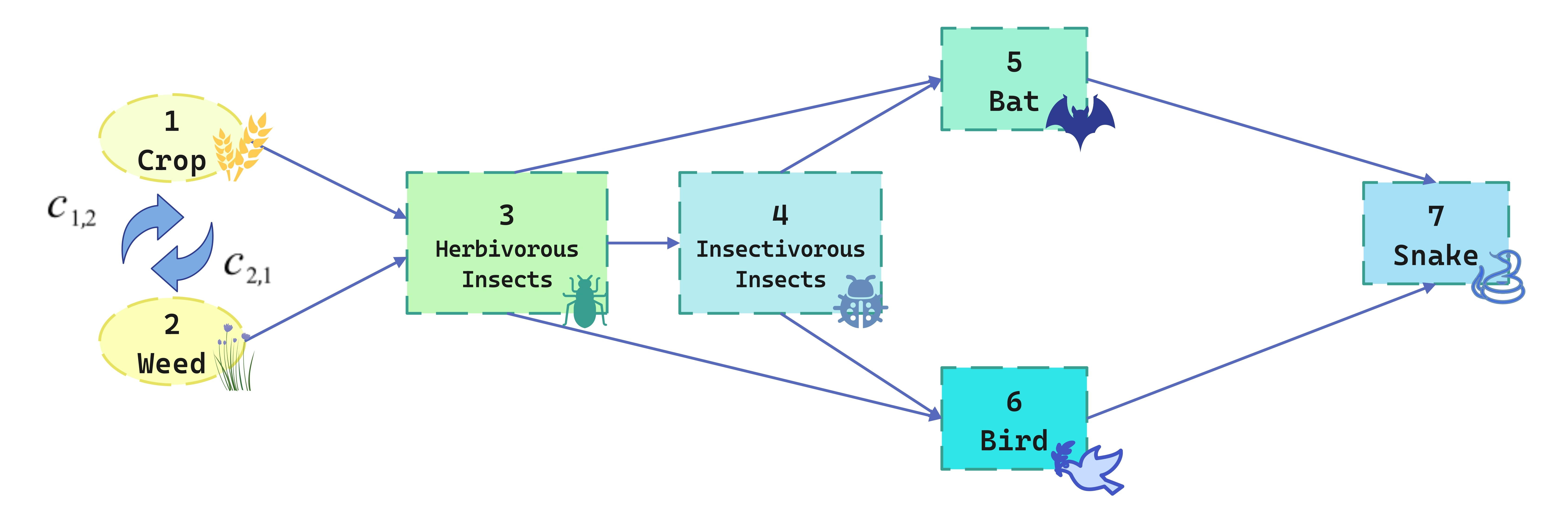 但随着时间推移,农业生态系统逐渐变得稳定,本地物种又逐渐回归农业生态系统。随着高级消费者的回归,简单的食物链模型不再能够描述农业生态系统中复杂的关系。因此在这一节中,我们对AENCM进行更深一步的拓展,考虑复杂的食物网为生态系统带来的影响。