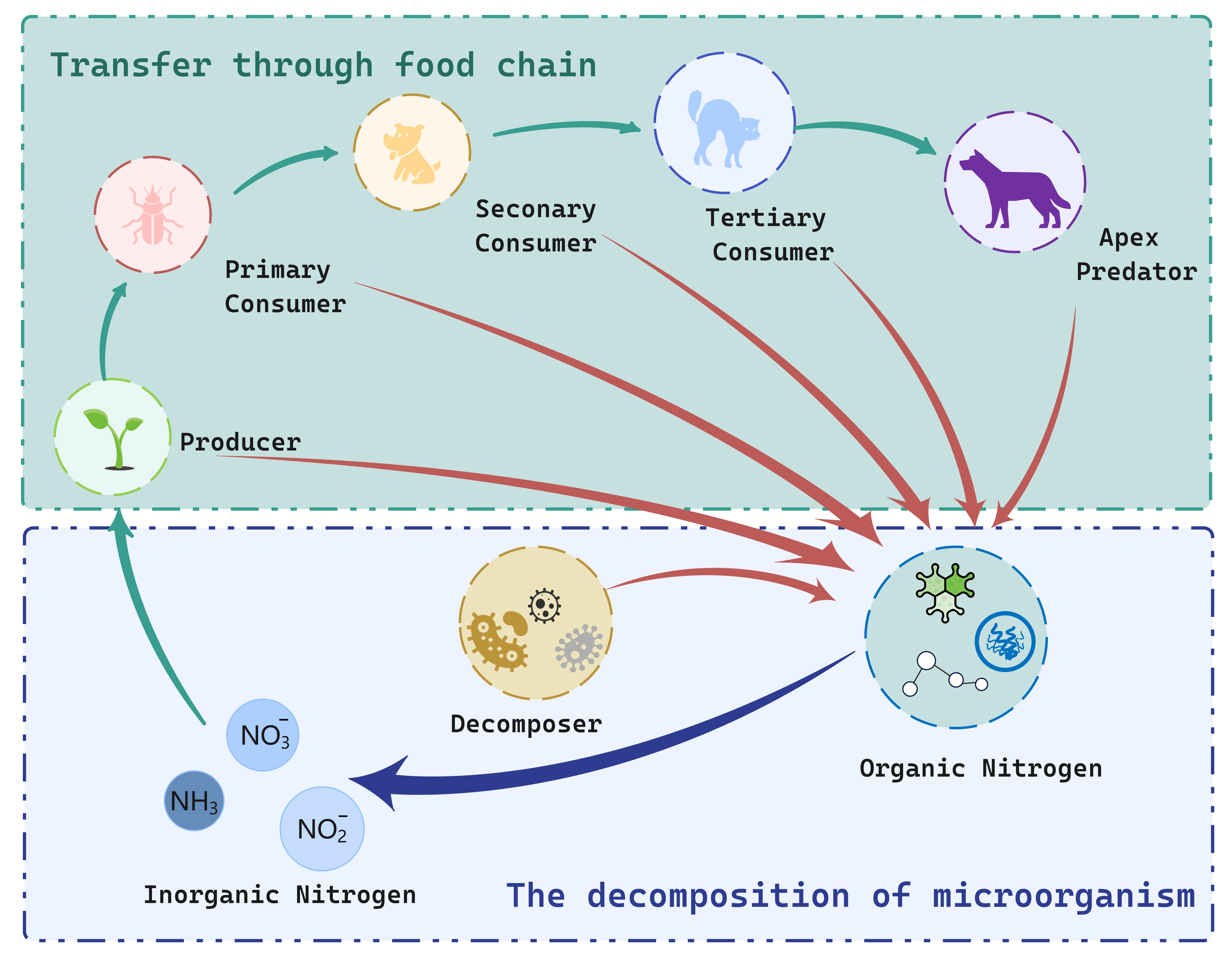 食物链中的生产者和各级消费者产生的粪便及死后残体,在分解者的分解作用下由含氮有机物转化为可供初级生产者直接利用的含氮无机物。具体过程如下图所示: