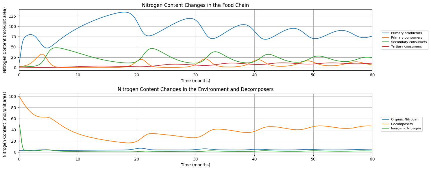从图中我们可以发现,在时间\(t=20\)个月之后,食物链中生产者及各级消费者的氮含量开始呈现有规律的周期性变化,环境中的有机氮和无机氮含量也逐渐趋于稳定。同时可以看到在我们模拟的结果中,环境中无机氮都会稳定在一个较低的水平,而更多的氮都存在于生物体内,这也与实际研究中的结论相符(见参考文献).