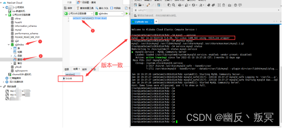 上图包含了通过 Navicat15 和 Xsehll5 查看MySQL数据库版本的方式