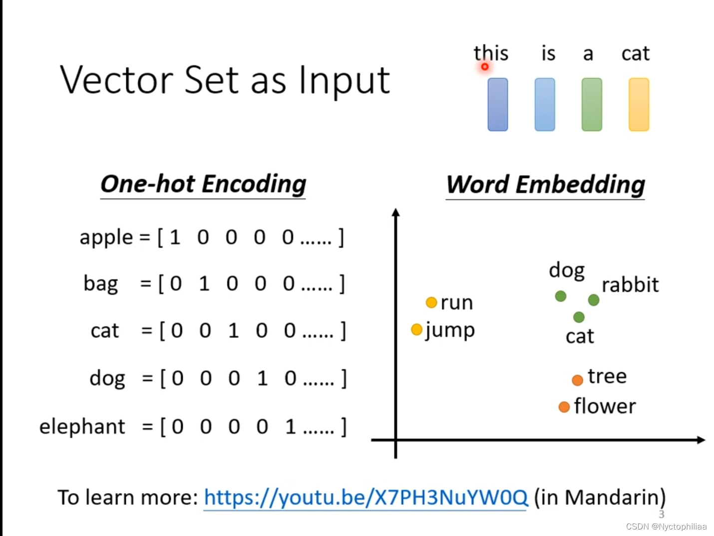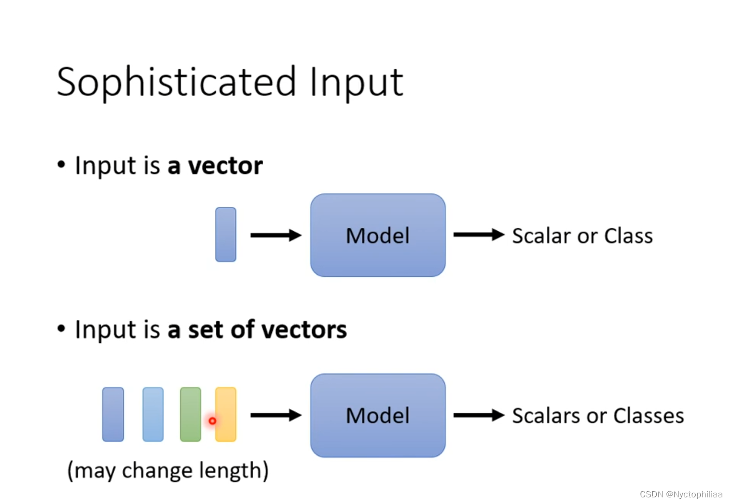 到目前为止,我们network的input是一个向量,output是一个数值或者类别。或者输入是一组向量,而且这组向量的大小可以变,不一定都是同样大小的向量,output是一个数值或者类别。