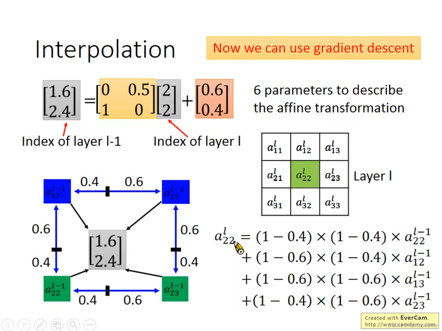 比如说我们已知平移后的坐标是[2,2],现在我们想知道它与谁相对应,通过给定的6个参数,我们得出[1.6,2.4],这时,我们不能用估算法去四舍五入说他与[2,2]相对应,而是应该找出它周围的4个点,然后分别计算出与这4个点的距离,之后便可以用Gradient descent的方法来得出结果。