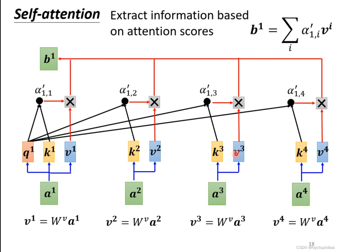如下图所示,不仅要a1和a2、a3、a4求关联性α,还要计算a1与自己的关联性α,然后对α1,1、α1,2、α1,3、α1,4求Soft-max,然后得到输出为一排α。我们需要根据相关性来抽取重要的咨询,把v1、v2、v3、v4分别乘上attention分数,然后加起来得到b1。这里不一定非要用soft-max,用激活函数ReLU也是可以的。