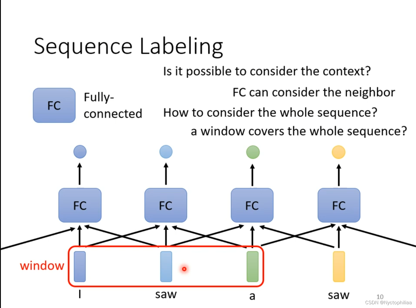 我们用Fully-connected对输入进行处理,得到正确的输出。但是现在存在一个问题,当输入的词汇有两个saw时,输出一个是动词,另一个是名词,但实际上是不可能有同一个输入有两个不同的输出。我们可以联系上下文来解决这个问题,给Fully-connected整个window的咨询。 现在某个任务需要考虑整个sequence,我们就用一个更大的window,但是这样不只是运算量大,还有可能造成overfitting。那我们应该怎么解决这个问题呢?