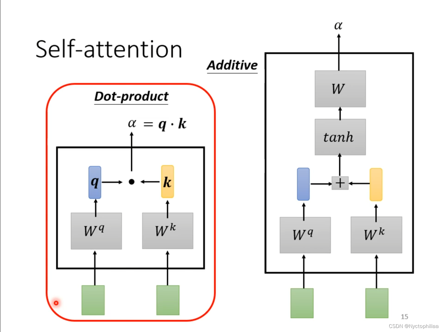 举例说明产生b1向量的过程,其它b向量的产生的过程与之类似。首先找出sequence中与a1相关的其它向量,其它向量与a1相关的程度用α表示。常见的做法是Dot-product,将输入的两个向量分别乘上两个不同的矩阵,得到q和k,q和k相乘并求和后得到相关性α。另外一种做法是Additive,将输入的两个向量分别乘上两个不同的矩阵,然后加起来输入到激活函数tanh,再经过Transform得到相关性α。