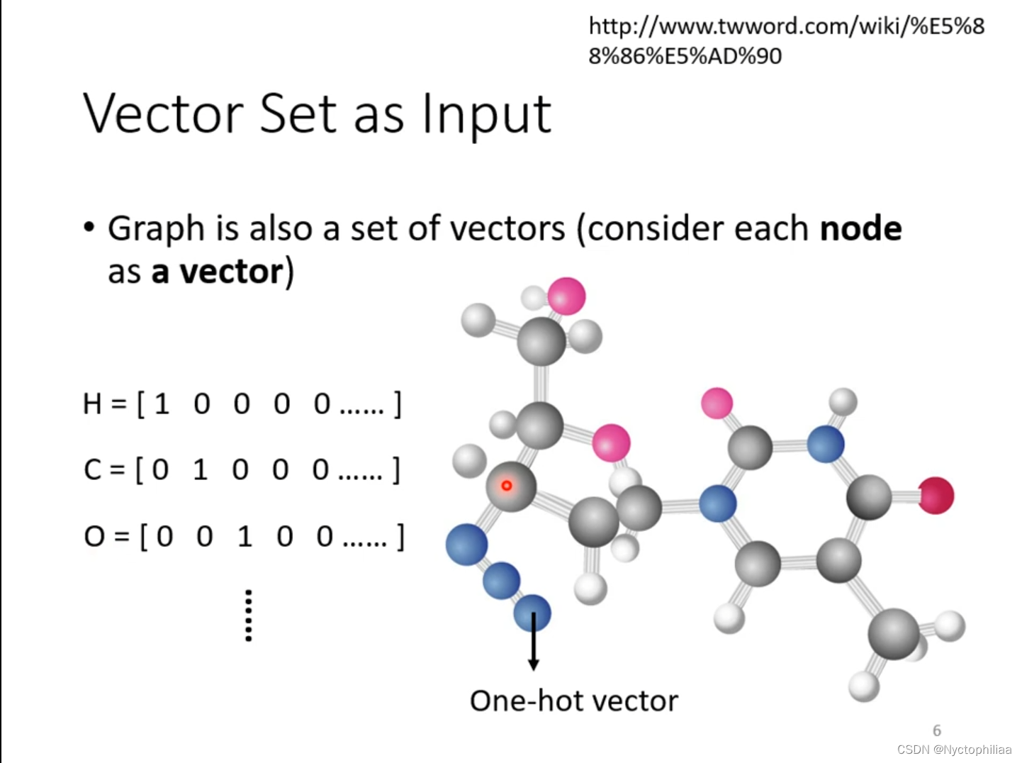 一个分子也可以看成图片,把分子当成模型的输入,分子上的原子(图中的球状体)就是一个向量,用One-hot vector来把原子表示成向量。