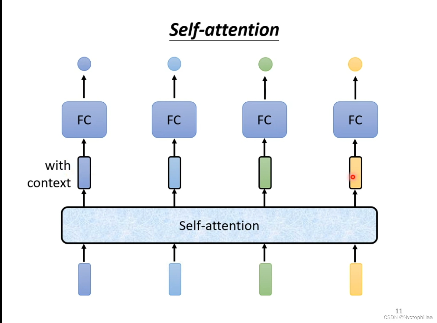 Self-attention就是把整个sequence作为输入,输入多少个向量,输出也就多少个向量。然后把输出放入Fully-connected,得到最后的结果,现在的Fully-connected考虑了整个sequence。