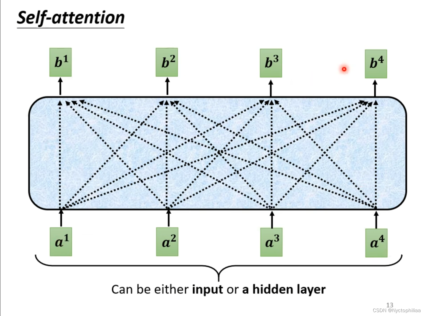 Self-attention的input是一串vector,vector可能是整个network的input,也可能是某个hidden layer的output。如下图所示,图中的b都是考虑了所有a得出的结果。