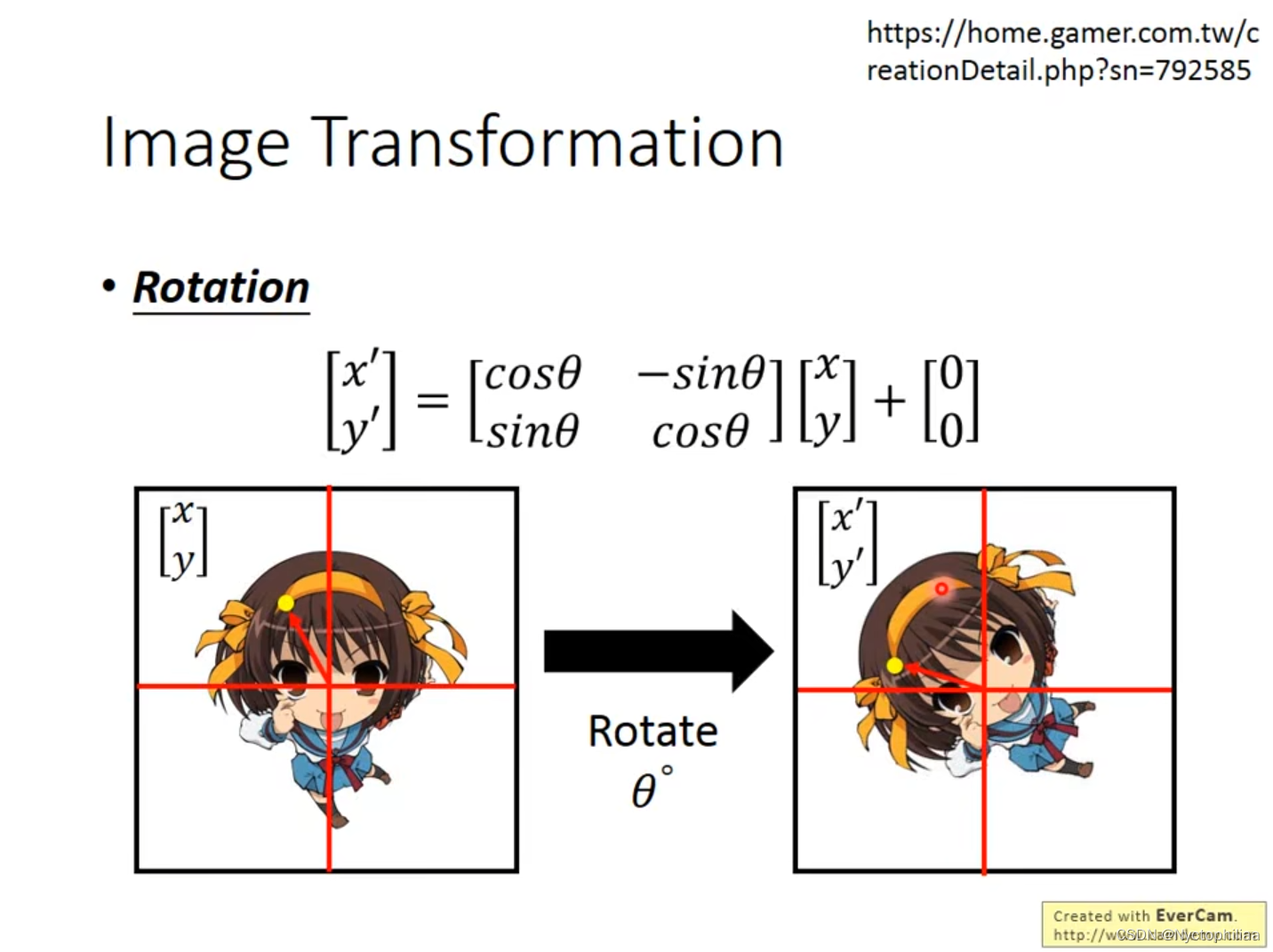 在下图中,是把图片向左进行旋转,旋转多少度由自己决定,然后在原来的图像上乘上一个矩阵即可。