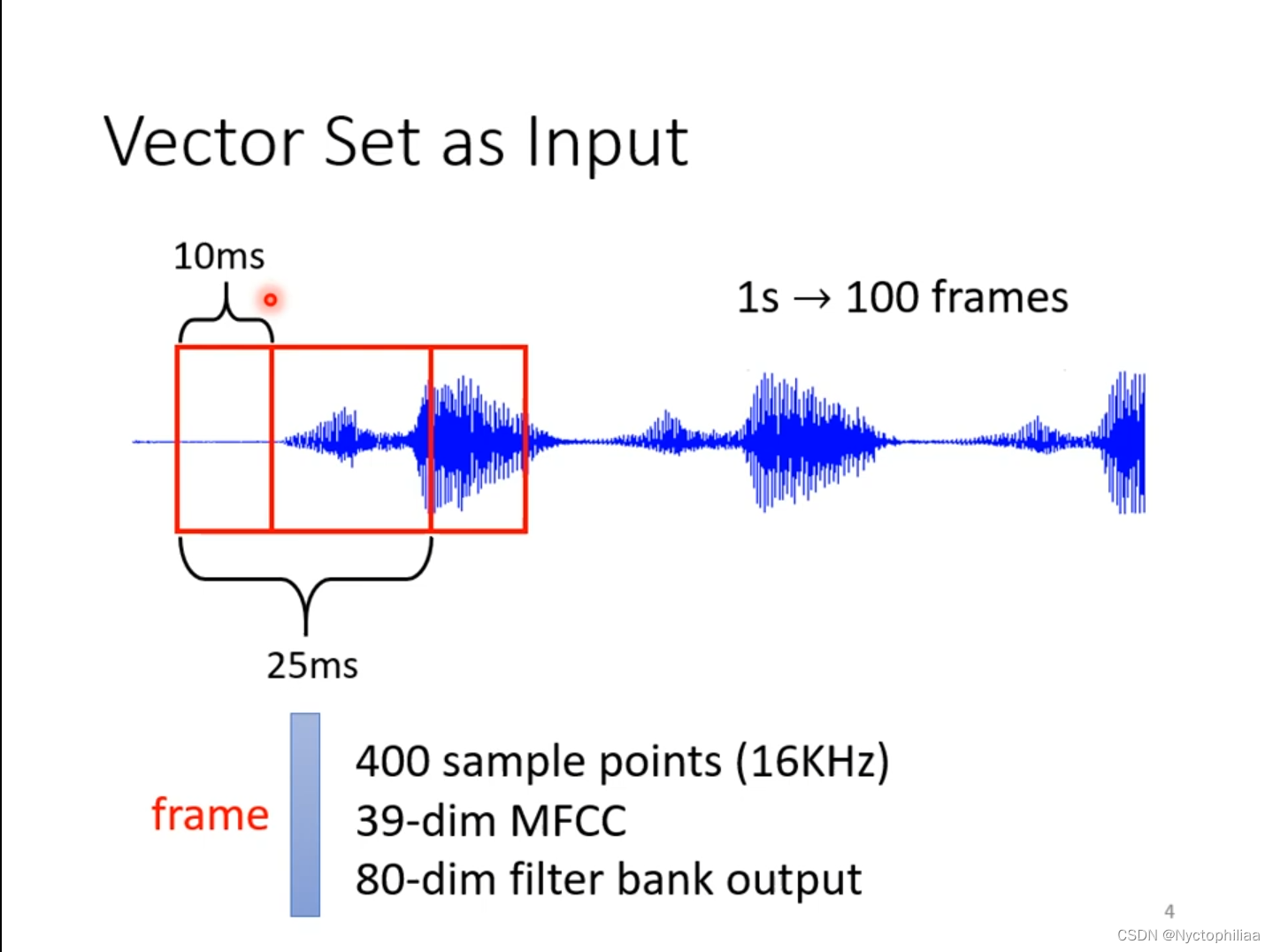 声音讯号,其实是一串向量,取其中一个范围window,把里面的咨询描述成一个向量frame