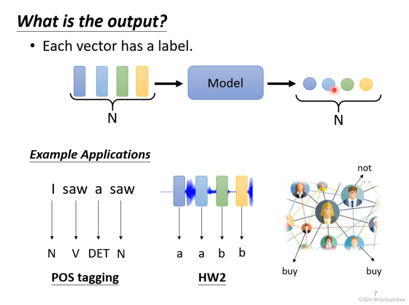 1、每一个向量都有一个label,也就是模型输入有n个向量,输出就有n个label。文字处理,现在要做POS tagging,它主要是得到词汇的词性。在图中有两个saw,一个是动词,另一个是名词,这个就是文字处理的难点。语音辨识,图中的每一个向量得到对应的音标。