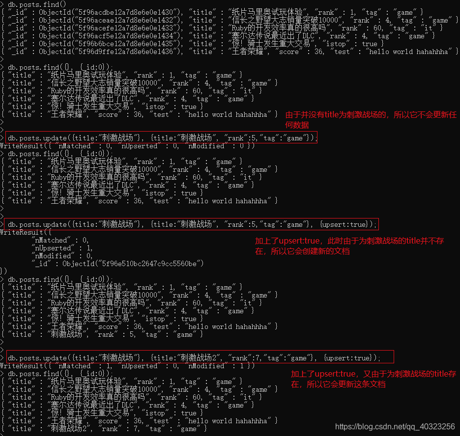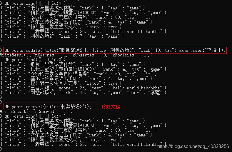 upsert:有则更新、无则追加remove:根据条件删除数据实验如下:移除文档移除所有文档:db.posts.remove({})这里就不实验了