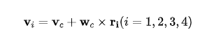 那就先从逆运动模型开始:已知点CENTER速度[vc wc]T,需要分解到各个麦轮上,采用平面刚体运动规律分析方法,单个麦轮的速度是由点CENTER速度及角速度共同作用合成的,可表示为