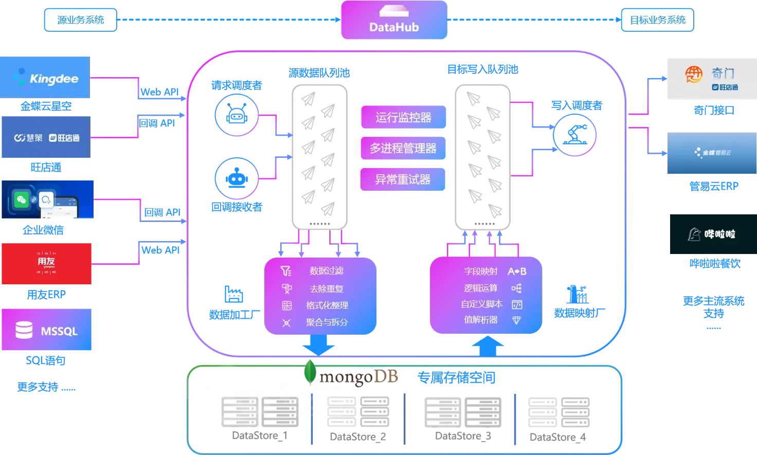 - 高效稳定且灵活扩展:支持多种部署方式,确保高性能、高可用,为业务流提供高数据吞吐量。