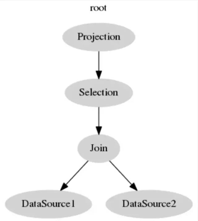 select b from t1, t2 where t1.c = t2.c and t1.a > 5 变成逻辑查询计划之后,t1 t2 对应的 DataSource,负责将数据捞上来。上面接个 Join 算子,将两个表的结果按 t1.c = t2.c连接,再按 t1.a > 5 做一个 Selection 过滤,最后将 b 列投影。下图是未经优化的表示: