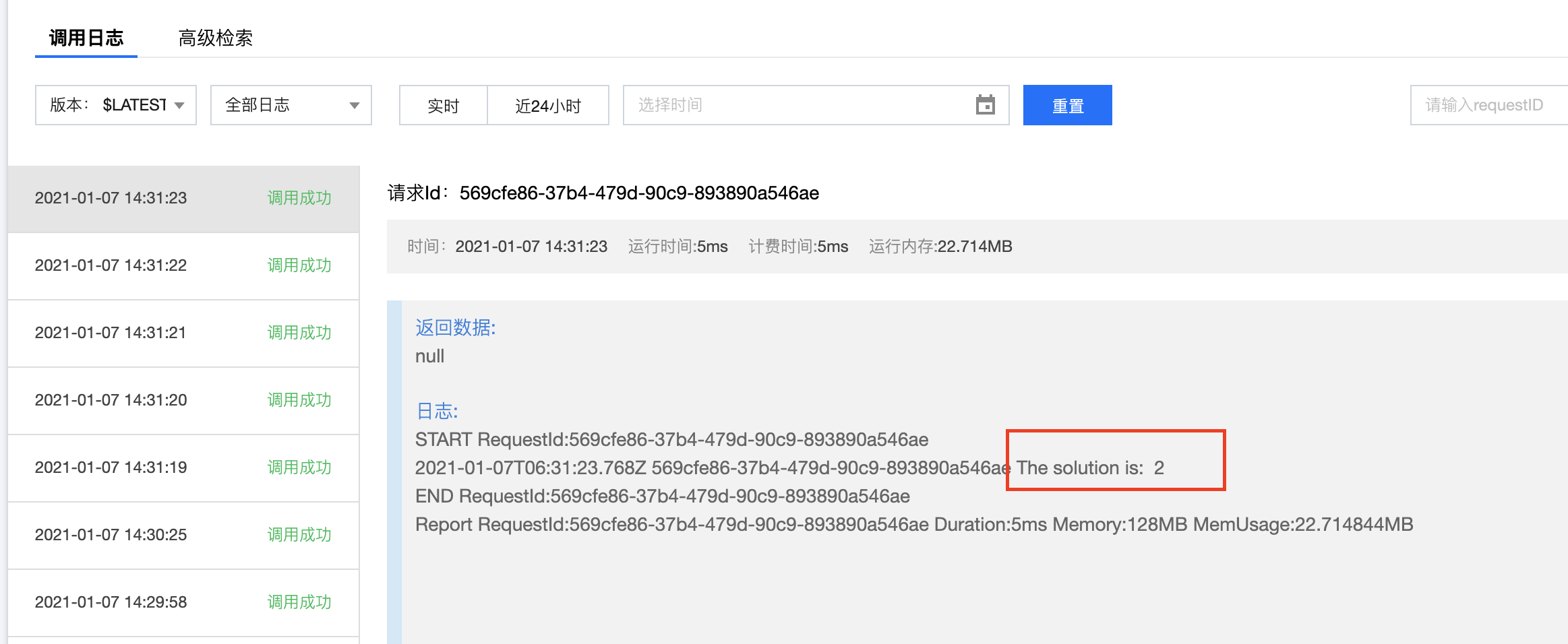 部署成功后,您可通过 云函数控制台,查看并进行函数调试,测试成功如下图所示: