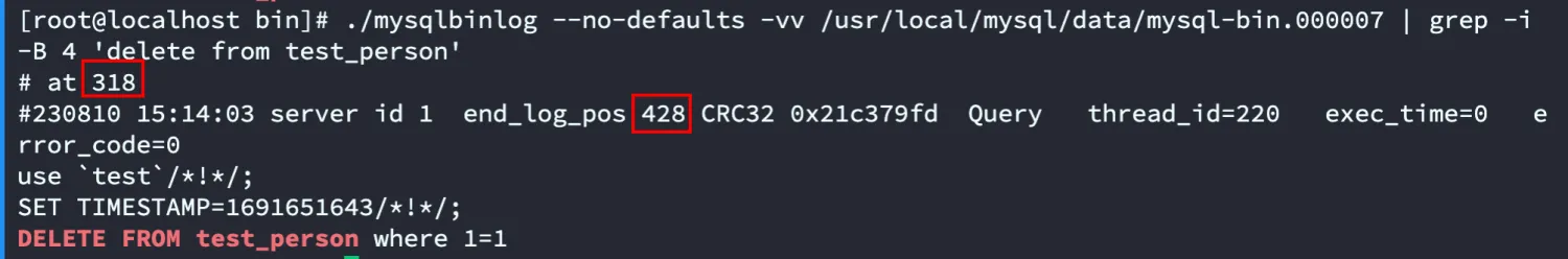 ./mysqlbinlog --no-defaults -vv /usr/local/mysql/data/mysql-bin.000007 | grep -i -B 4 'delete from test_person'
