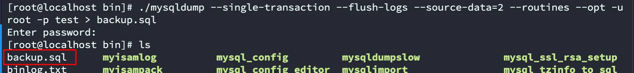 ./mysqldump --single-transaction --flush-logs --source-data=2 --routines --opt -uroot -p test > backup.sql