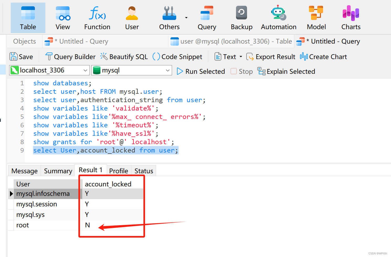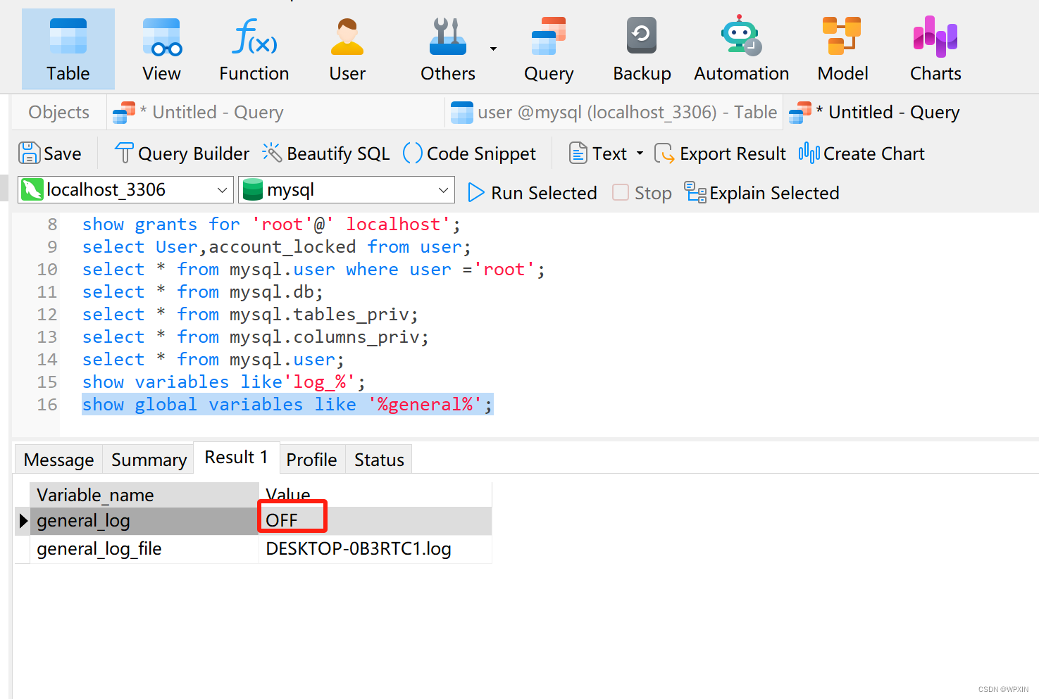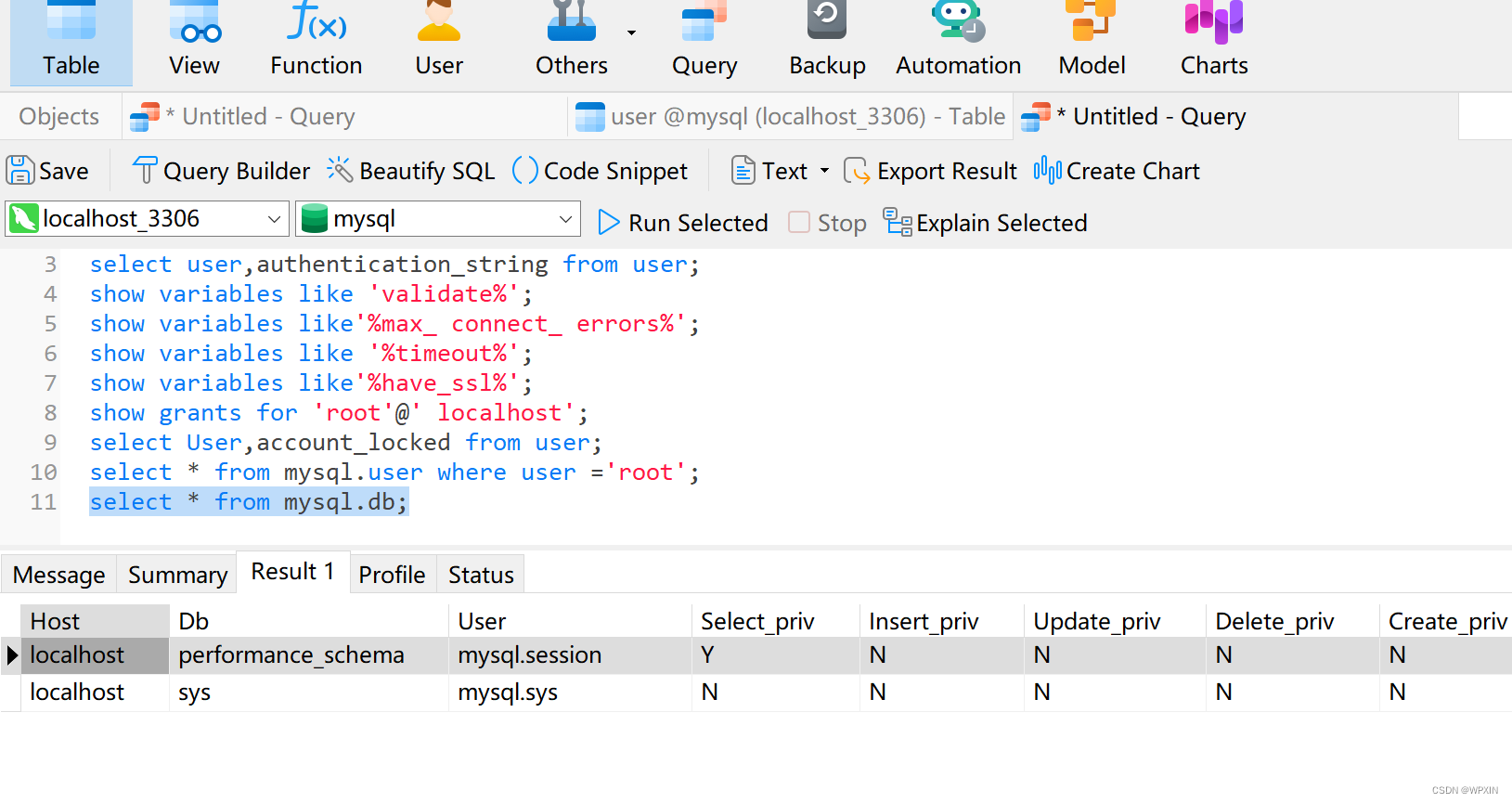 2.在根据具体的用户名查看权限表,确定权限,select * from mysql.user where user = '用户名'