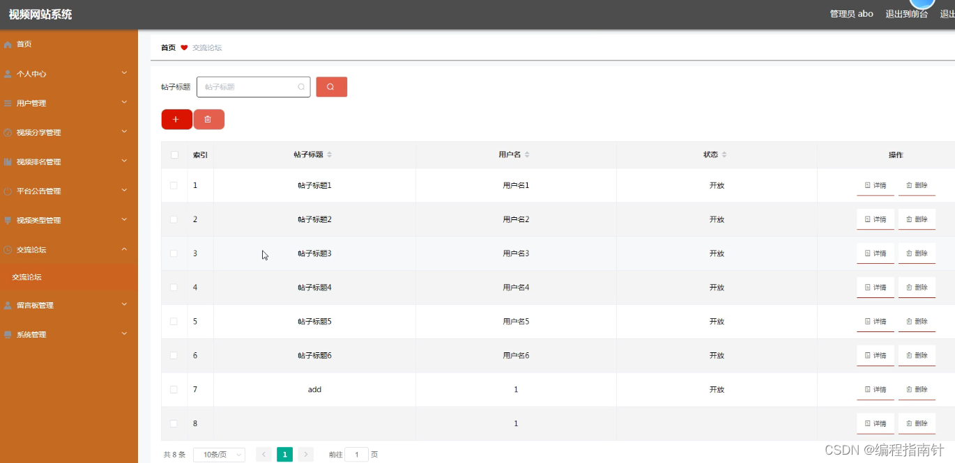 管理员管理交流论坛,可以添加,修改,删除交流论坛信息。下图就是交流论坛管理页面。