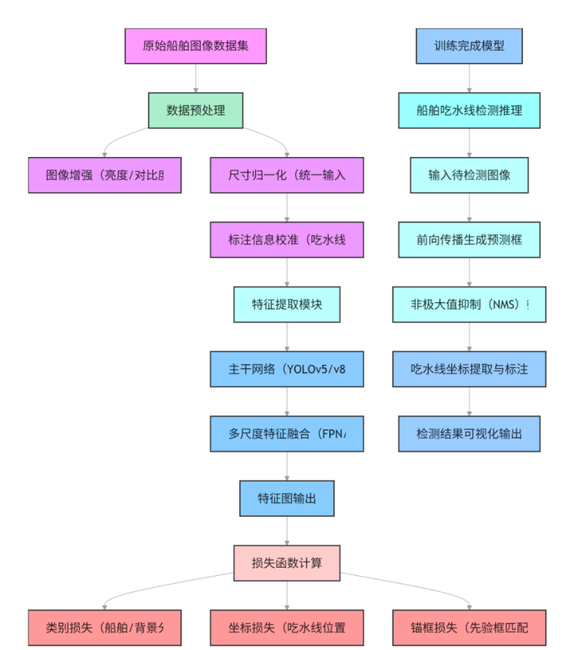 在AI船舶吃水线检测系统中,数据分析与特征提取是至关重要的环节。首先,系统会对收集到的大量船舶图像数据进行预处理,包括去噪、增强对比度、调整亮度和色彩平衡等操作,以确保图像质量满足后续处理的要求。接着,利用YOLO算法进行目标检测,快速准确地识别出船舶的位置和轮廓,为吃水线的检测提供基础。在目标检测的基础上,系统会进一步提取图像中的关键特征,如边缘、纹理、颜色等信息,并结合船舶的结构特点,对吃水线进行精确的定位和测量。这些特征提取过程通常涉及到图像处理算法和深度学习模型的结合,通过船舶和优化模型,不断提高检测的准确性和鲁棒性。