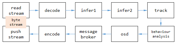 读取流。从网络或本地机器获取视频流。解码。将字节流解码为帧,因为算法只能作用于图像。推理。对图像进行深度学习推理,如检测、分类或特征提取。跟踪。跟踪视频中的目标。行为分析/逻辑处理。分析目标的轨迹、属性。OSD。在图像上显示结果,用于调试或得到直观效果。消息代理。将结构化数据推送到外部,供业务平台使用。编码。对包含结果的帧进行编码,以便传输、存储。推送流。将字节流推送到外部或直接保存。