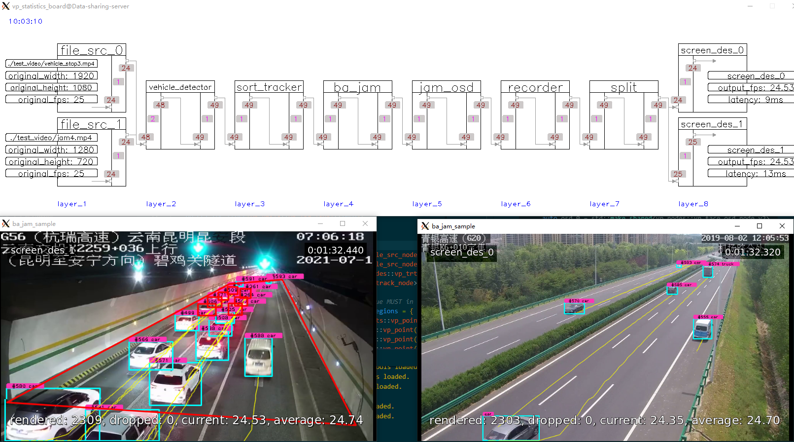 一个用于视频(含图片,下同)分析的图像算法集成框架。它可以处理复杂任务,如流读取(从本地或网络)、解码、基于深度学习模型推理(分类/检测/特征提取/...)、跟踪、行为分析(逻辑处理)、数据叠加(OSD)、数据转发(如Kafka/Socket)、编码和流推送(RTMP或本地文件)。整个框架采用面向插件的编程风格,我们可以使用各种不同类型的插件,即框架中的Node类型,来构建不同类型的视频分析管道。