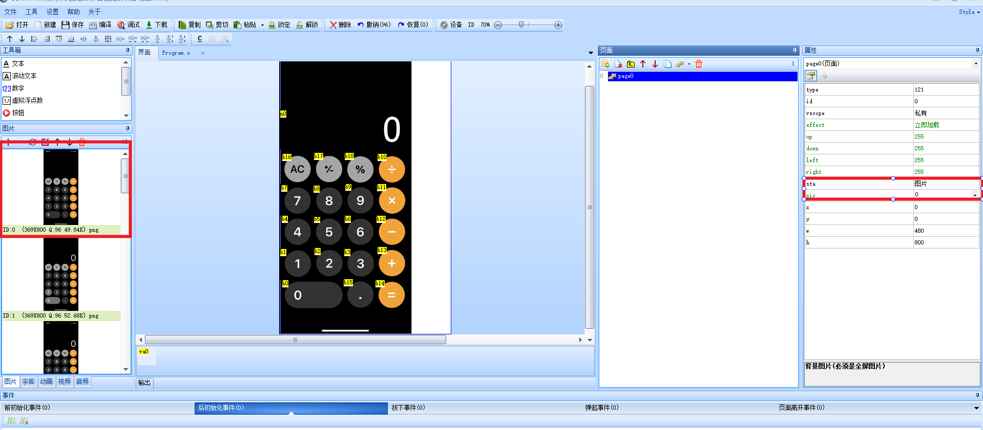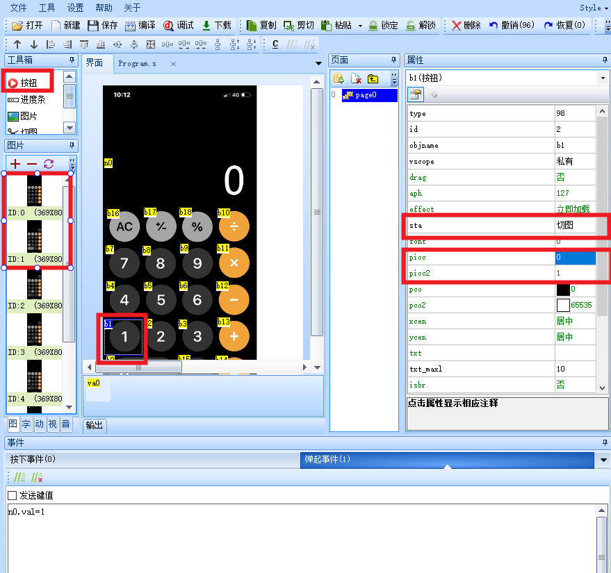 b1(按钮)为例,sta设置成切图,picc设置为编号是0的照片,picc2设置为编号是1的照片。