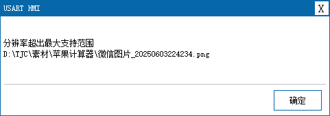 根据设计需求,准备好符合尺寸和格式要求的图片。一般来说,需注意图片分辨率与串口屏分辨率适配,以保证显示效果清晰。本例程的是淘晶驰x5,分辨率是800*480。直接插入苹果手机的截图会提出如下提示“分辨率超出最大范围”。